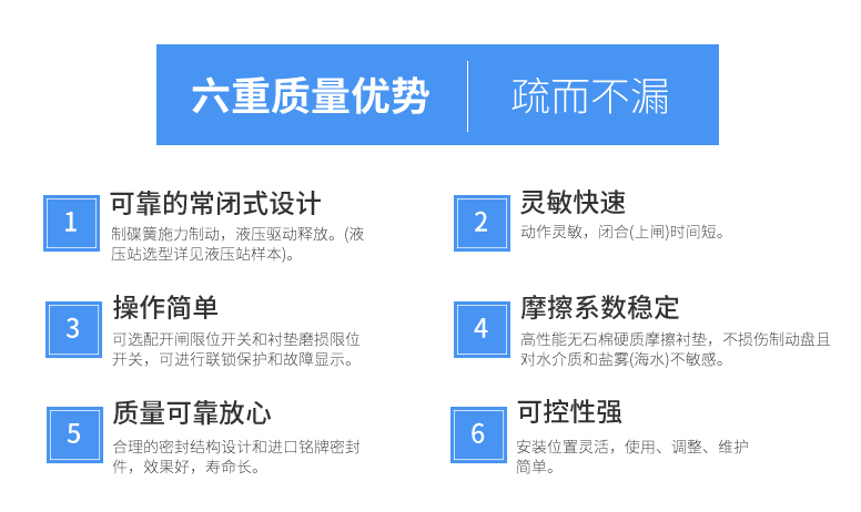 三、質(zhì)量過(guò)硬的主推產(chǎn)品公司以市場(chǎng)為導(dǎo)向,不斷開(kāi)發(fā)培育新品種,開(kāi)發(fā)推廣的優(yōu)良新品種有盤(pán)式制動(dòng)器(安全制動(dòng)器SB,SBD系列、電力液壓臂盤(pán)式Y(jié)PZ2系列、氣動(dòng)鉗盤(pán)式QP(CQP)系列)、鼓式制動(dòng)器(電力液壓YWZ系列、電磁鼓式ZWZ3系列、腳踏式TYW系列以及帶式制動(dòng)器DZ系列)、防風(fēng)制動(dòng)器(液壓輪邊型YLBZ系列、頂軌式Y(jié)DGZ系列和夾軌器YJGQ系列)和驅(qū)動(dòng)裝置(Ed系列、YT1系列和隔爆型BEd系列)。
