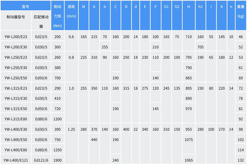 YW-L系列的電力液壓鼓式制動器的安裝尺寸符合DIN15435和JB/T7021-2006標準,技術要求符合JB/T6406-2006標準。